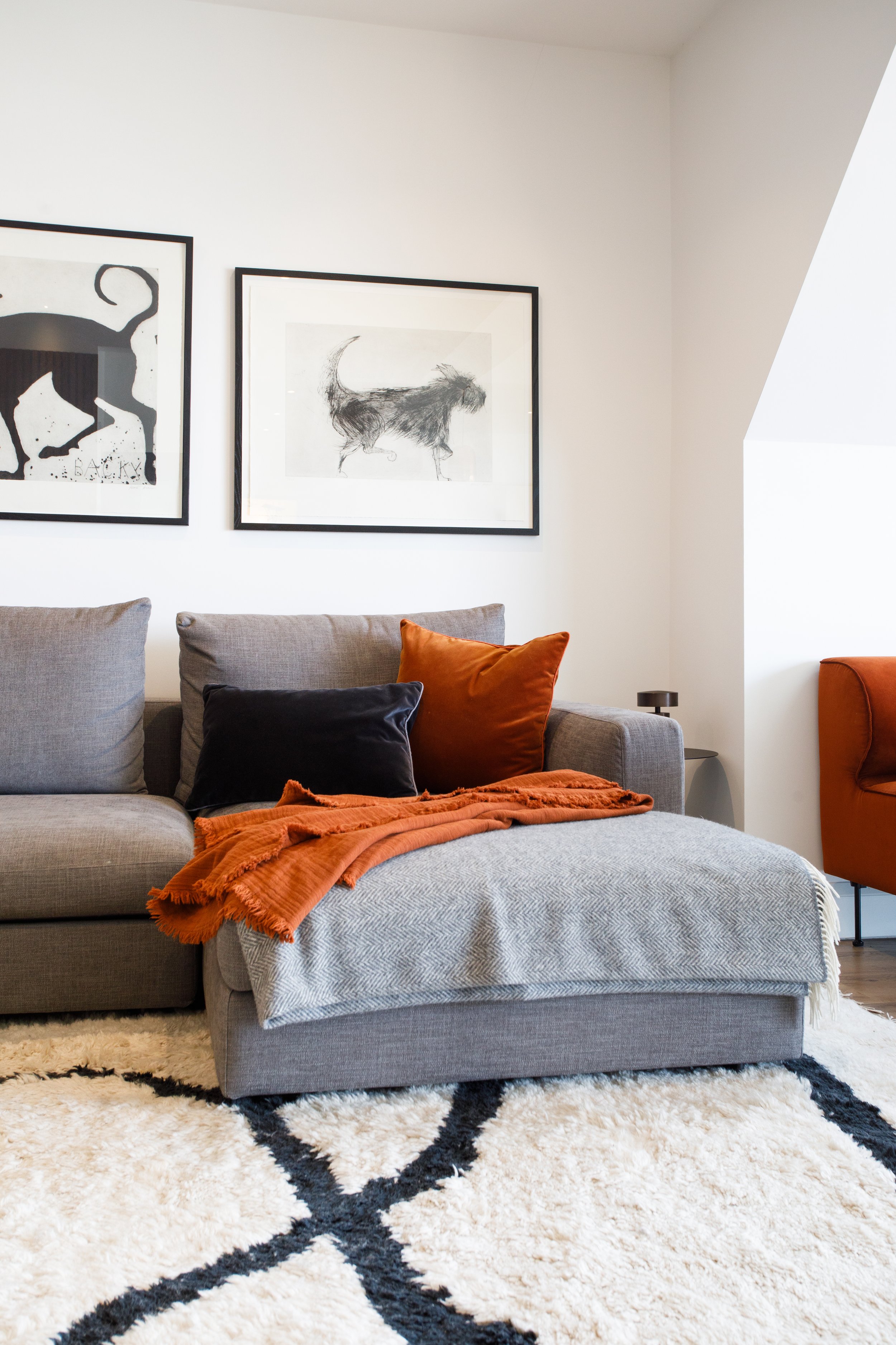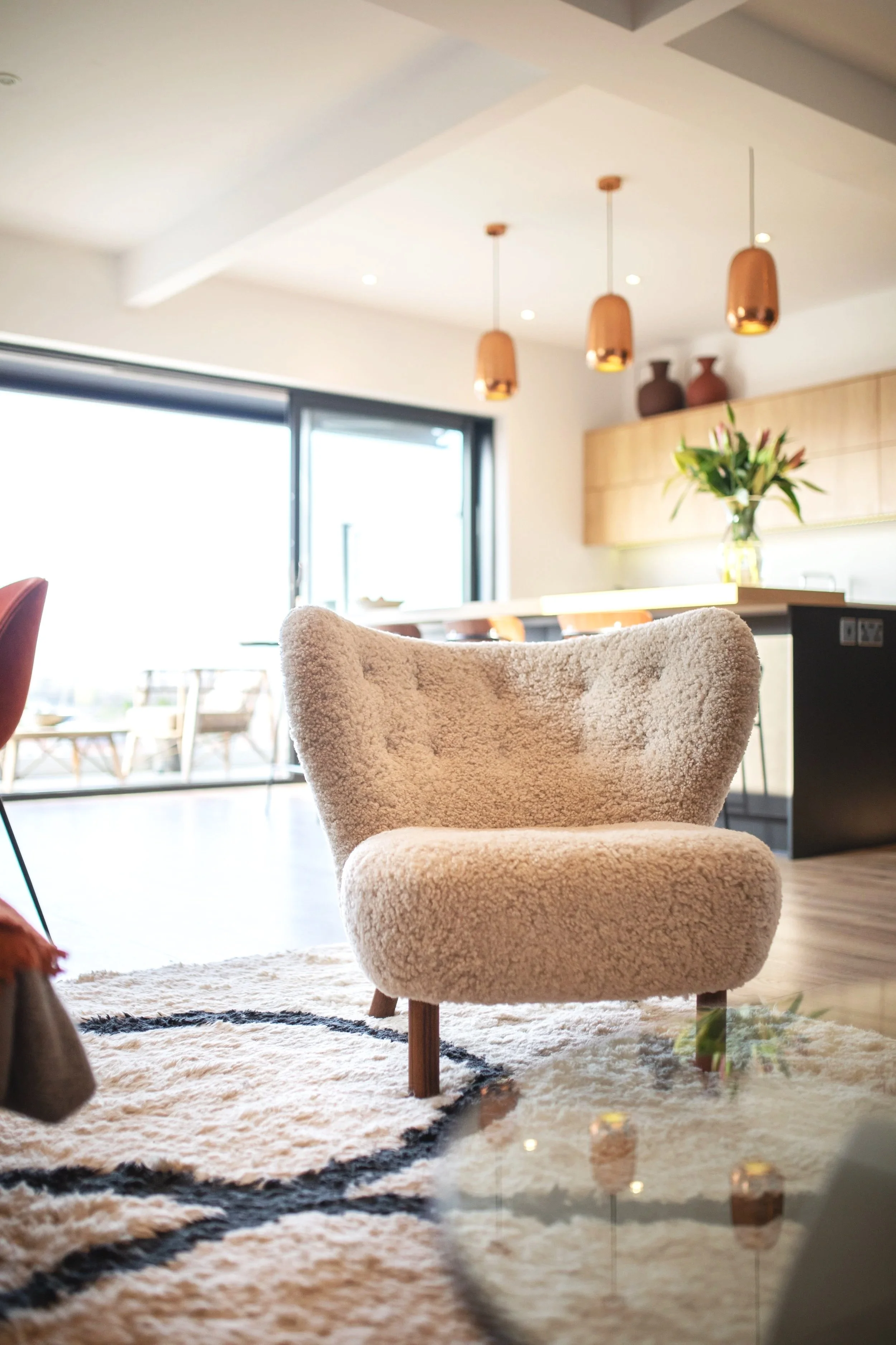 Throughout, high-quality pieces were selected not just for impact, but for longevity. A rust velvet Gubi dining bench anchors the open-plan kitchen space with warmth and structure. A sheepskin ‘Petra’ chair adds a touch of softness to the living area. Quirky Kate Boxer artworks inject wit and movement into otherwise minimal walls.